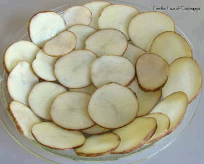 Veggie Quiche with Potato Crust: Adapted recipe and photos by For the Love of Cooking.net Original recipe by Yellowfish- 1 1/2 – 2 russet potatoes, sliced very thin