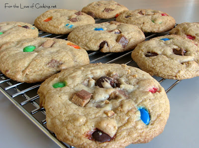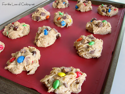 Drop by rounded spoonfuls on cookie sheets. Add the remaining M&M’s and Reese’s Peanut Butter Cup pieces to the top of the cookies.