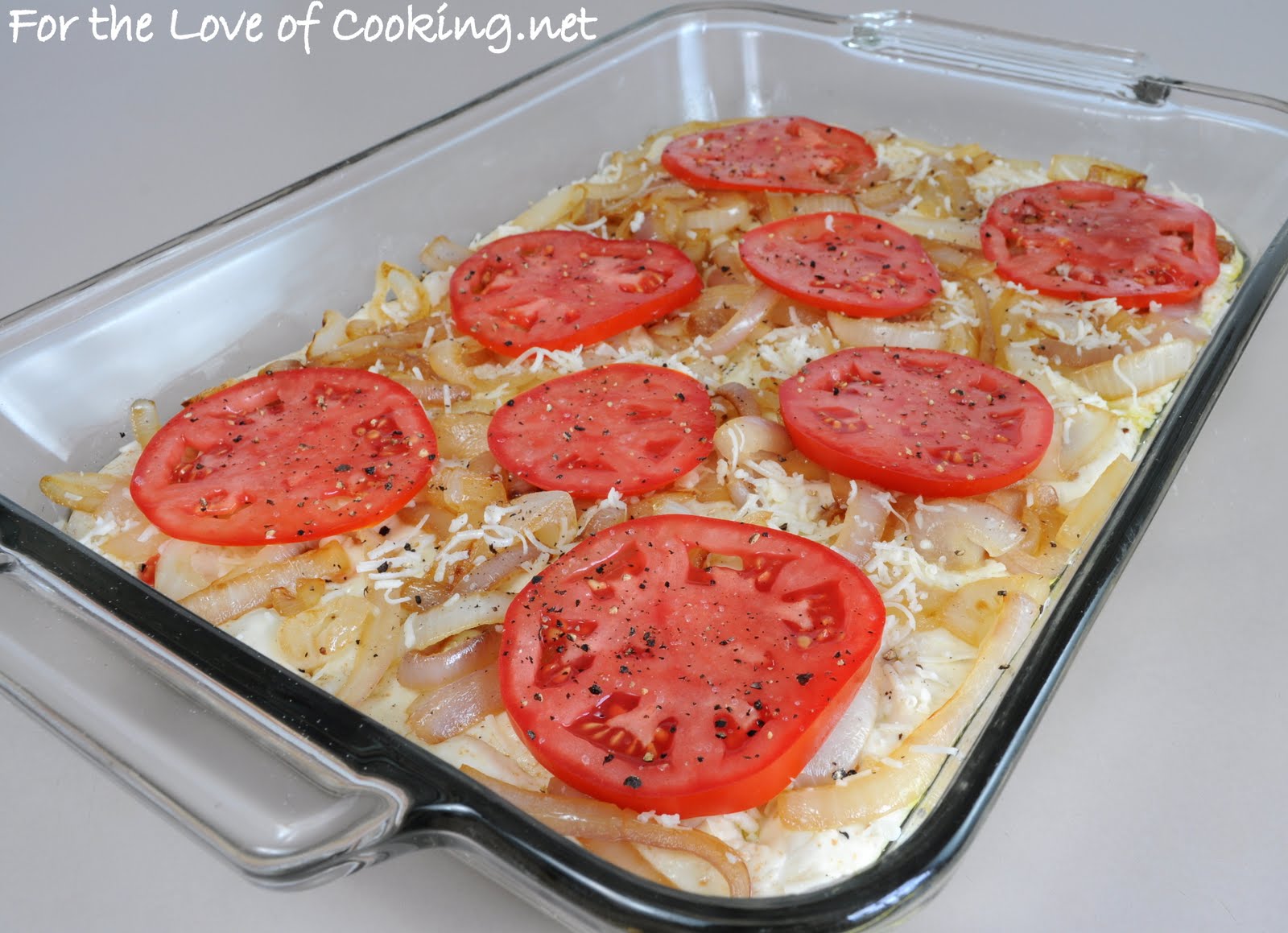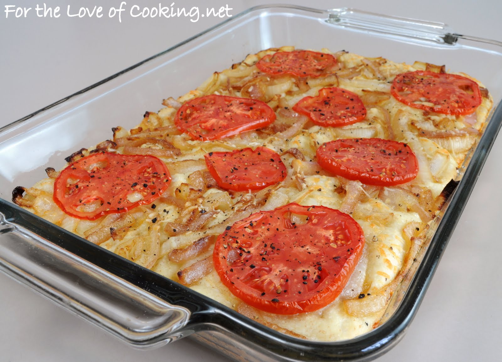 Gently need the dough a few times then stretch the dough out with your fingers and place it into the baking dish, pressing the dough down into the bottom of the dish. Use your fingers to punch tiny indentations into the top of the dough. Drizzle a little more olive oil on top of the dough then spread the caramelized onions evenly over the top, next sprinkle a bit of Asiago cheese over the onions, then finally layer with tomato slices and season with sea salt and freshly cracked pepper, to taste.
