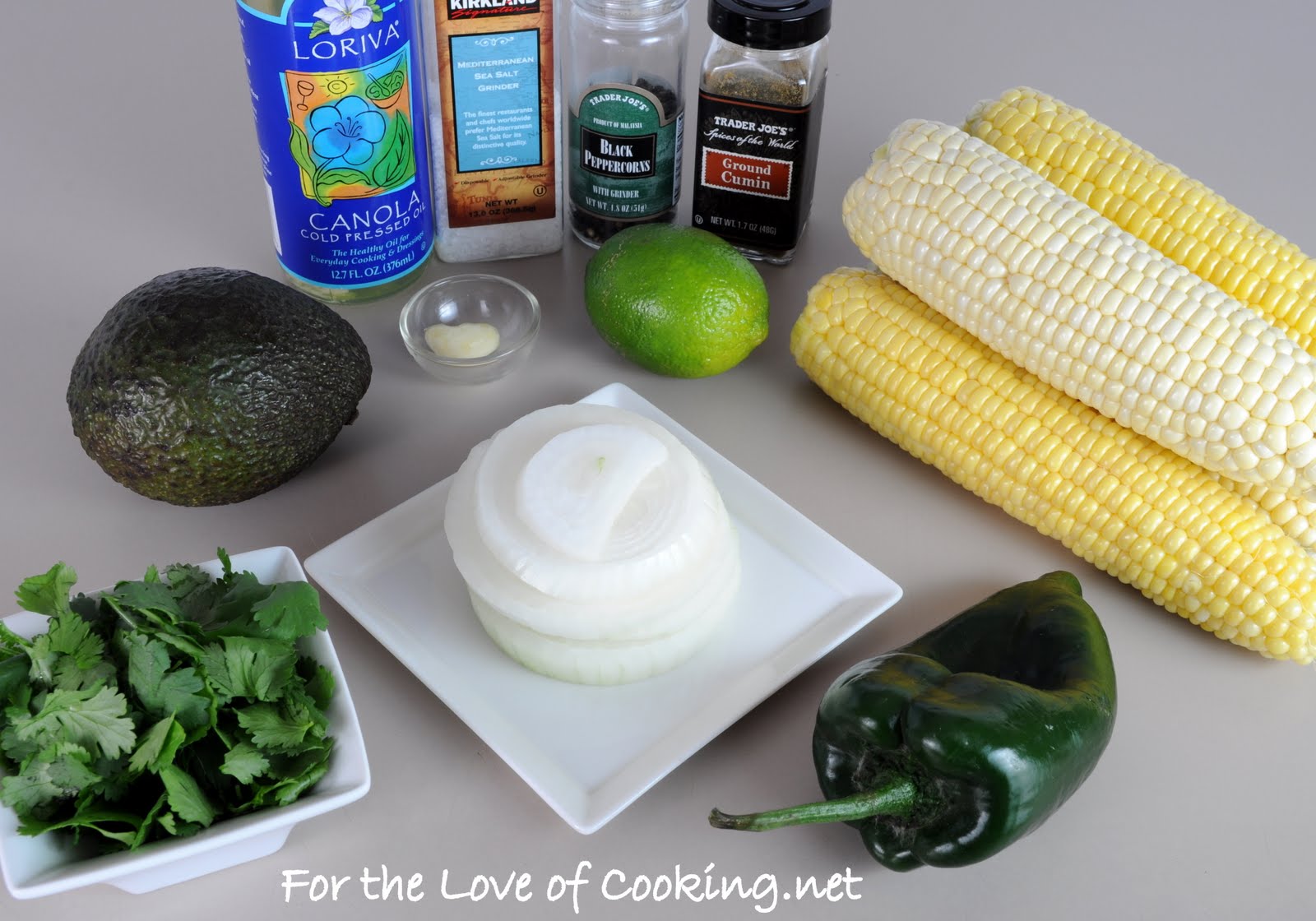 Once the corn has cooled, cut the kernels from the cobs into a large bowl. Add the grilled onions, poblanos, avocado, and cilantro together in a bowl.