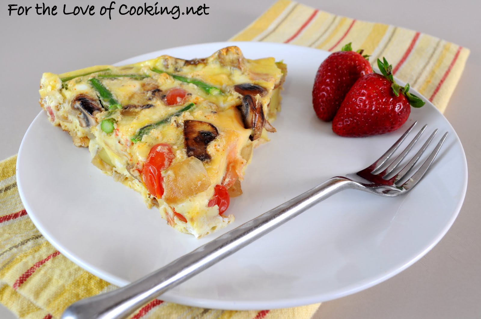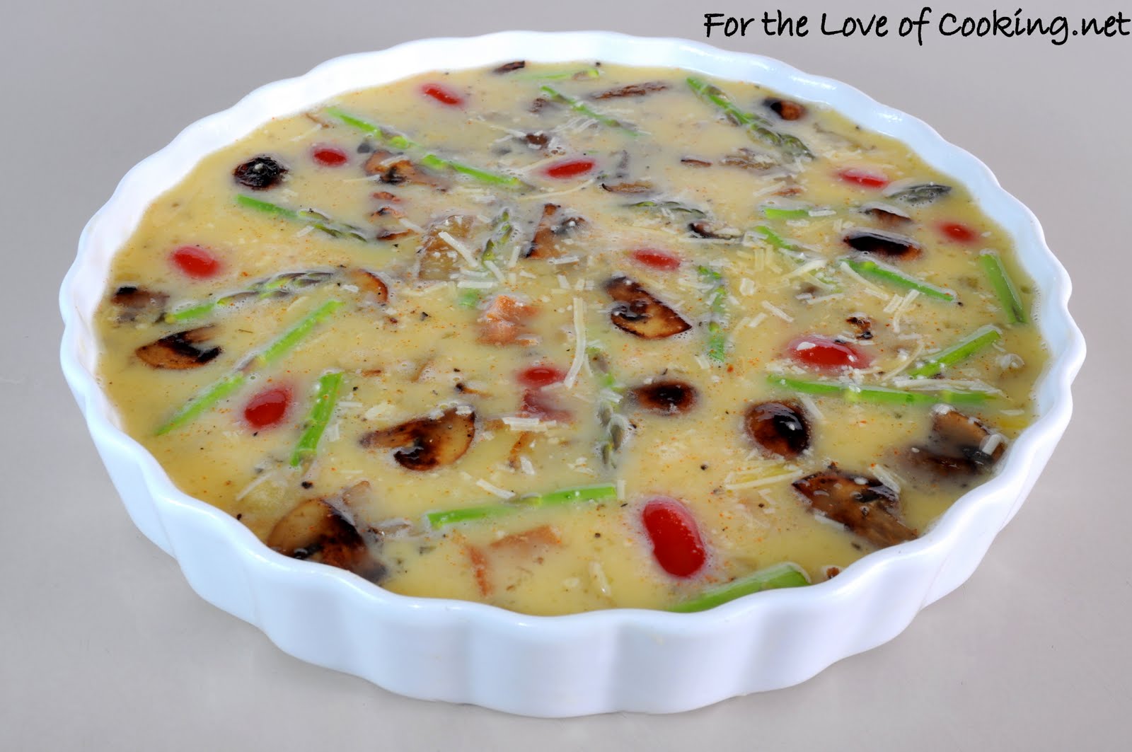 Frittata with Asparagus, Bacon, Asiago, Potatoes, and Caramelized Onions & Mushrooms: Recipe and photos by For the Love of Cooking.net- 4 slices of lean bacon, cooked & crumbled