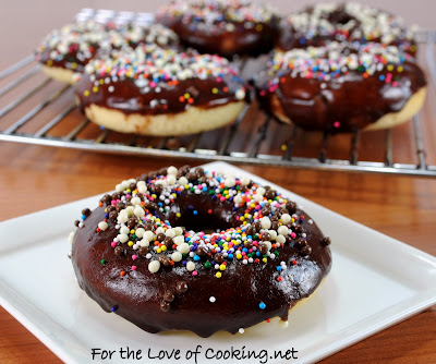 My daughter recently celebrated her 9th birthday (gulp, is she really that old -time is flying way too fast!) and she wanted me to make homemade donuts for her party instead of a cake. I just got a new donut baking pan so I was excited to put it to use. She wanted plain donuts with a chocolate glaze. The donuts were super simple to make and so was the chocolate glaze. The girls all decorated their own donuts and loved them. They all agreed that I should make these donuts for the food blog (which is good because I had leftover chocolate glaze to use up).