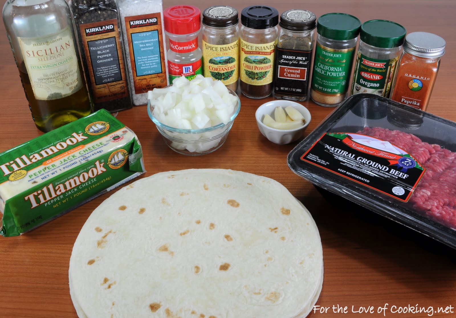 Heat the olive oil in a large skillet over medium heat. Add the ground beef and break the meat into crumbles. Add the onion as well as the seasonings then cook for 4-5 minutes, stirring occasionally, until the meat is cooked through and the onion is tender. Add the minced garlic and cook, stirring constantly, for 1 minute. Remove the beef mixture from the stove and set aside to cool.