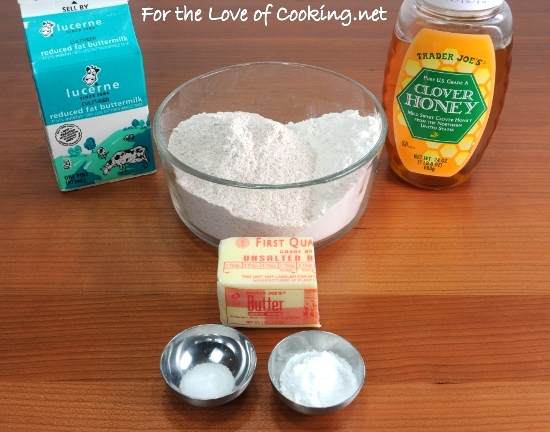 Combine the flours, baking powder, and salt together in a bowl. Cut in the butter with a pastry blender or two knives until the mixture resembles course meal. Place into the refrigerator for 10 minutes to chill. In a smaller bowl, combine the buttermilk and honey and whisk until well blended. Add the buttermilk mixture to the flour mixture and stir until mixed.