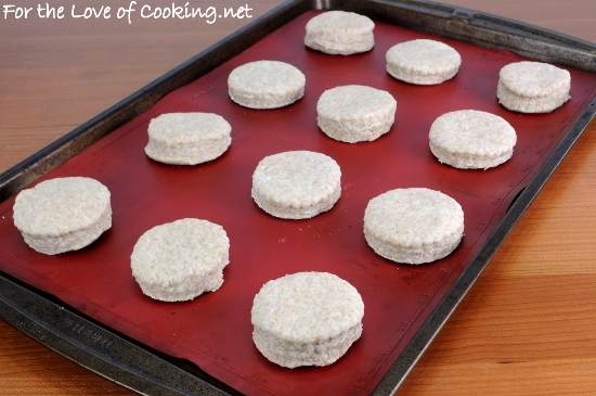 Place the dough on a well floured surface and knead 4-5 times. Using a rolling pin, roll the dough into a 9 x 5 inch rectangle. Dust the top with flour then fold the dough crosswise into thirds (like folding a letter to fit into an envelope). Re-roll the dough into a 9 x 5 rectangle, dust the top with flour, and fold the dough crosswise into thirds again. Gently roll or pat the dough into a 3/4 inch thickness and cut with biscuit cutter to form biscuits. Place dough rounds 1 inch apart on the baking sheet.