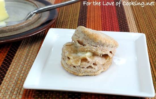 I wanted to make some biscuits to serve with the Vegetable Noodle Soup I made recently and decided to make them a little more healthy by using mostly whole wheat flour. I was a little worried they would turn out too dense but instead they turned out really delicious and had great flaky layers. I loved the nutty flavor the whole wheat gave these biscuits and they were extra tasty with some butter slathered on them. These biscuits were perfect for dipping into our veggie soup and they tasted great the following day too.