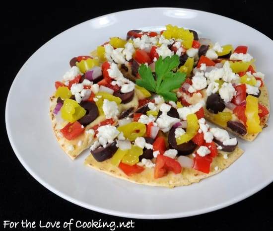 Remove the tortilla from the skillet then spread the hummus over it. Top the tortilla and hummus with pepperoncinis, roasted bell pepper, tomato, red onion, kalamata olives, and feta cheese. Place the tortilla back into the skillet for 1-2 minutes to heat through. Slice into wedges with a large knife. Serve immediately. Enjoy.