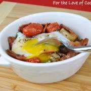 This is basically a “clean your fridge” kind of breakfast. I was craving a baked egg but decided to make it a little more hearty but adding in the leftover Garlicky Roasted Potatoes with Herbs and some Roasted Asparagus and Tomatoes that I had in the refrigerator. I cooked it in the oven for a few minutes then finished cooking it under the broiler. The egg was cooked and tasted fantastic when mixed with the other ingredients. It was a great way to use up leftovers and a healthy and delicious start my day.