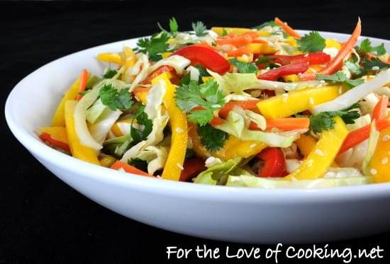 This is another recipe I found on Skinnytaste that I couldn’t resist. I adapted it a bit to work with what I had on hand. I was disappointed that I couldn’t find black sesame seeds anywhere because I think the slaw would looked even more beautiful with them. I loved the crunchy cabbage, carrots, and bell pepper with the sweet mango and tangy dressing. My kids didn’t say much about this slaw but they did eat nearly all of their portion which is great. My husband and I both loved it and had seconds. This cabbage mango slaw paired perfectly with the Asian Turkey Meatballs with Lime Sesame Dipping Sauce for a healthy and delicious meal!
