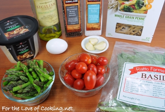 Mix the egg, Parmesan cheese, sea salt, freshly cracked pepper, to taste until well combined. Drain the pasta and immediately add the cheese/egg mixture to the pasta and stir until well combined and the cheese has melted. Add the tomato and asparagus mixture to the pan and mix until evenly coated. Place pasta into the serving bowl and sprinkle the top with the torn basil leaves. Serve immediately. Enjoy.