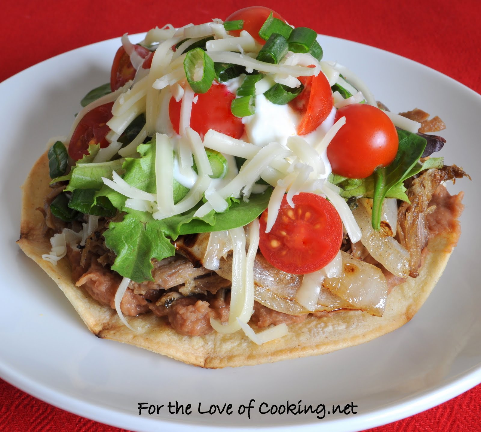 Heat the refried beans and leftover shredded pork in the microwave until hot. Spread the beans on the crisp tortilla, then add the shredded pork followed by some shredded Monterey Jack cheese. Next add the mixed greens, sour cream, tomatoes, green onions, and a little more cheese. Serve with your favorite salsa and eat immediately. Enjoy.